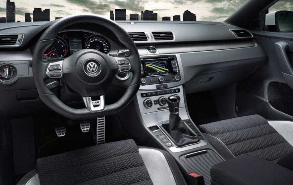 stainless steel finish and a flat bottom steering wheel adorned. The R line